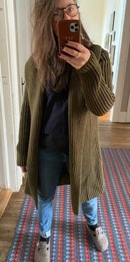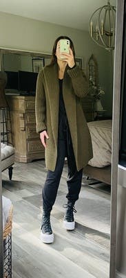 I wish I could have worn this everyday. It’s a little more of a brownish-green, but it’s heavy, falls nicely, super cozy and can be dressed up or down. Loved it.
