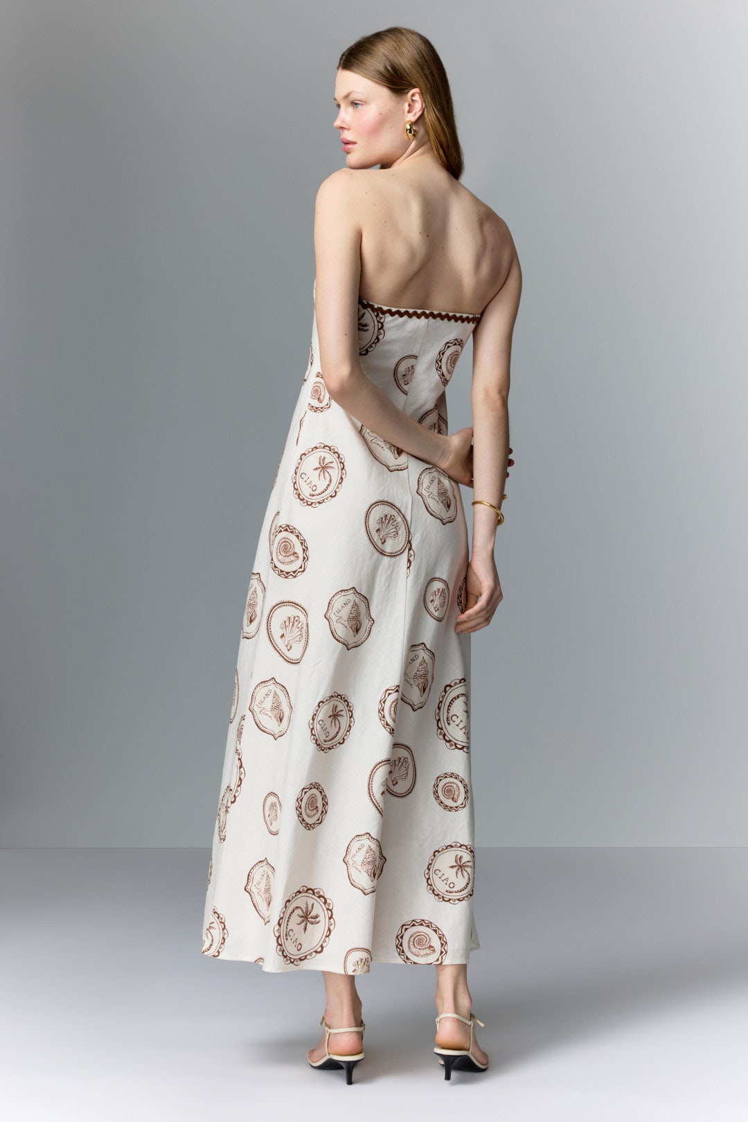 Kivari's Ciao Strapless Maxi Dress features a fitted bodice, all adorned with hand-sketched shells and coastal-inspired stamps on a soft ivory base. Pair it with strappy sandals or espadrilles for a relaxed, feminine look.