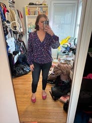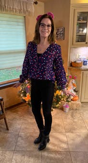 This is a very flattering blouse, note a bit tight in the shoulders. Wore this for work and then dressed up with jewelry to celebrate a birthday.
