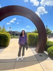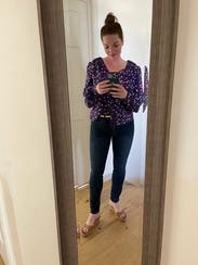 I really like the fun colors in this top, and it's such a nice purple. It's very comfortable and light and it flows well, especially over the stomach which is my trouble area. I did wear a cami underneath it for work since it's a bit low cut, but would go without a cami if I wore it out to dinner or something.