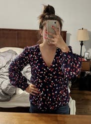 I wore this to work and had to wear a cami underneath so as not to show any cleavage! If I were wearing it out with friends, I wouldn't have worn the cami. I loved the sleeves and print on this shirt. It paired nicely with a dark pair of jeans. I would rent this again!