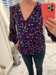 Easy blouse to wear for a fun pop of color. The subtle puff detail at the wrist is a nice touch but not obnoxious. It does have a lower V but I found it flattering and it also fit my chest well.