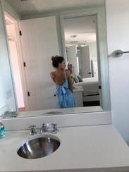 Blue printed satin (100% polyester). Sheath. Sleeveless. Square neckline. 45.5" from shoulder to hemline. Imported.