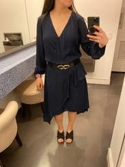 So flattering and fun. I wore it to a work conference and it was a great twist on a classic color and silhouette. It's cinched at the waist and lays beautifully. Still contemplating buying it!