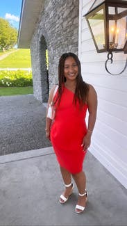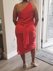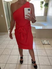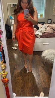 Received this dress as a backup, didn't actually wear it. It's a fun cut and color, but too high maintenance for me. The fabric is very thin, so I definitely would've needed to wear spanx and just the right bra. I'm currently pregnant so I thought the tie in the front would cover my bump well, but wanted something more forgiving and easier to wear. You could see all the bumps in my bigger than usual butt, lol. I would recommend this if you're on the thinner side.