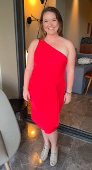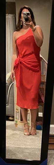 Perfect dress for a 90 degree fall wedding outdoors and an indoor reception. Not restricting, easy to move in and dance in. Classy, simple, and I loved the one shoulder. I got lots of compliments! I dressed it up with gold strappy heels, gold earrings, bracelets, watch, and purse. Definitely need to wear shapewear underneath because of the chiffon material. I used to be a size 4 and with my COVID weight, now wear a size 8-10. This made me feel pretty and comfortable. I’m 5’3” and 139 pounds, 36C.