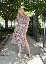 This print is perfect for summer and the fabric is a nice lightweight cotton that breathes in hot weather. Pro This dress is a compliment magnet. It can be casual when worn loose or it can be dressed up with accessories. The ruffle stays up but it wasn't ever overbearing or intrusive. The pockets are deep and well-placed. Neutral The slit is on one side and runs to the upper thigh I played it for photo. There is a lot of fabric so consider ordering down. Con Might not be your personal style.