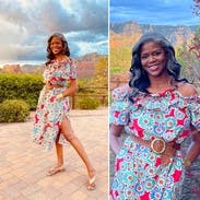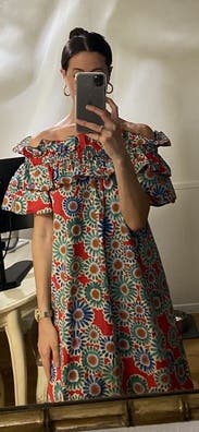 This dress was so good. Great colors, ruffles, fabric quality and soooooo cute on! Flowy fit would accommodate many body types. Dress up or down.