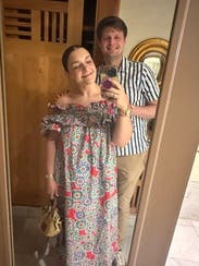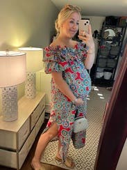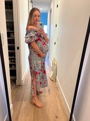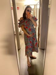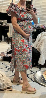 I wore this so many times throughout my pregnancy. During middle stage (pictured) all the way through I’m a whale stage. I felt cute in it but had to wear a belt under my bust to give it some shape. Received many compliments. It travels very well and wrinkles don’t show significantly.