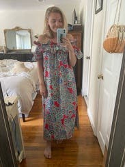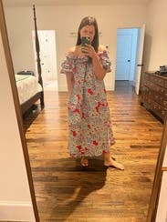 My husband said it best: “so baggy, pretty but lots of poof”… but it was nice to slip into after a day of sun and frozen adult beverages while on vacation. And it has pockets.