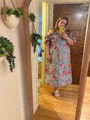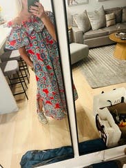 Got compliments all night in this dress! I dressed it up for a wedding and it worked, although the material definitely makes it feel like you could just wear it for the everyday. Loved how flowy and forgiving it was + pockets + how it just looked like it was ladouble j! Would rent again!