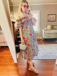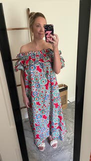Wore once as a swim cover up and once for a brunch date. Only con for me was the sleeves. I did wear them off shoulder as intended on the date because my kids weren’t around needing to be wrangled. But when we were at the pool I wore the dress strapless and then one shouldered because I needed freedom of movement. Maybe that’s a pro for some people, the 3 ways to wear it, but I prefer off the shoulder dresses to have the sleeves cut as separate pattern pieces and attached to the dress rather than designed as an actual part of the dress. Could have easily dressed it up with heels and jewelry for vacay. It’s a versatile dress. I style lots of RTR pieces on my IG: @jordanegray and LTK: @jordanegray 🤍🤍🤍