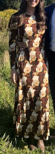 Very “1974 American Heiress in Venice.” Fabric is silky but not too thin. Open back was tricky because even as a 36B I needed breast lift tape because of the fabric & fit. I am 5’8 130 with broad shoulders and I think a medium would have fit better. I don’t get the feeling this dress is supposed to fit super close to the body. It’s really lovely.