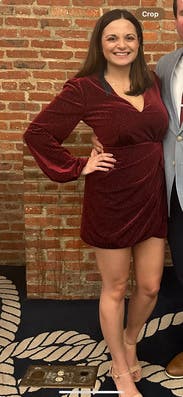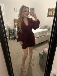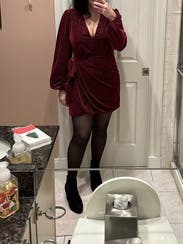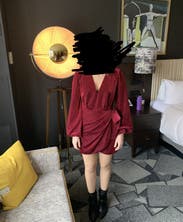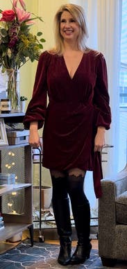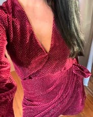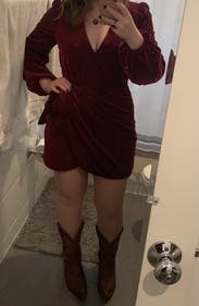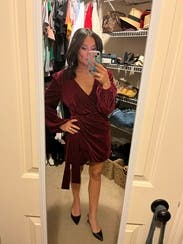 This dress just feels luxurious. The velvet is beautiful and I love the bishop sleeves. It's a faux wrap so you get the cute wrap look but you don't have to worry about the dress coming undone. It is VERY short, but I paired it with over the knee boots and a shacket. I didn't wear a bra as it's a little low cut, but it was very comfy. Perfect for a holiday part or a special occasion (I wore this to a night out for cocktails to celebrate my 33rd birthday).