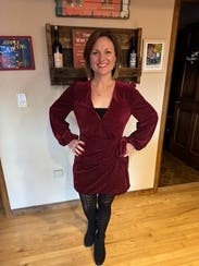 I wore this to a Fall wedding and was super comfortable wrapped in soft velvet. Tons of compliments!! Yummy burgundy color with a flattering tie waist and slightly billowy sleeves. Definitely recommend!