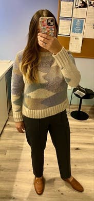I've been renting a lot of sweaters during the pandemic, because, sorry not sorry, tops are some of the only things visible on Teams! The colors pair well with denim for a casual look (or of course, leggings). I have sensitive skin so sometimes have a problem with wool, cashmere, and other cozy fibers regardless of if they are natural or not, and this felt fine! True to size!
