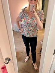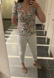 Loved this top!!! The print reminds me of vintage Ralph Loren and is so chic. Effortless chic is the look I always go for. The XS was a great fit. The fabric was more cotton than I was expecting from the photos, the fit was very flattering and will tuck in well to high waisted pants/shorts.
