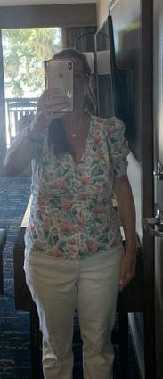 The print is one my grandmother would have loved but I love the style of the shirt. It is a bit low but for small chested women it works well.