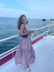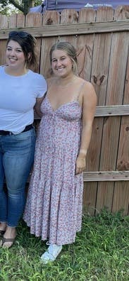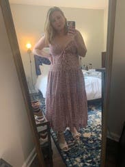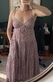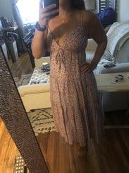 Rented this for summer in NYC, and I can't fully decide how I feel. I like the pattern and the slight shimmer, but the top is a disaster. You can't adjust the straps and middle tie as much as you would need to, making it impossible to wear without a bra if you have triangle shaped boobs (like I do unfortunately). I had to wear it with a bralette, which made it look better, but the straps were visible, and I had to pull the straps and middle super tight (not comfy). Got lots of compliments tho