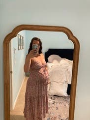 This dress was very pretty and made you feel feminine. Definitely a dress that shows the girls. I opted not to wear a bra and used fashion tape to prevent gaping. Fit my 32 week bump.