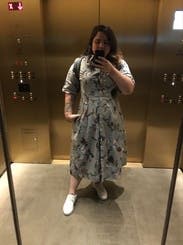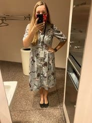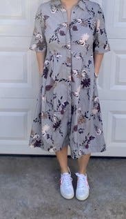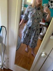 So I rented an XLR after reading reviews about the button popping a bit at the chest. So the chest fit great, but I felt the rest of the dress was swimming on me. It was fine for a day teaching. It was comfortable and I paired it with some blue Keds to give my feet a rest! I might rent again in a large and just wear a tank under the top…