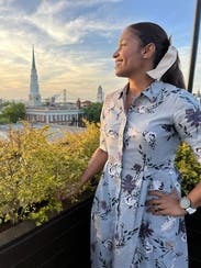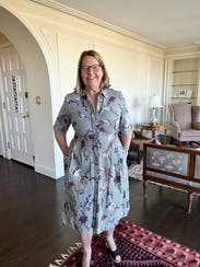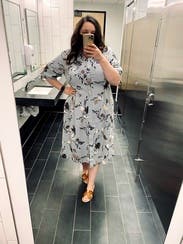 This dress fits beautifully! It gives a very feminine shape while the pattern and stripes keep it toned down. Good fabric weight for most of the year in Houston. Versatile for work, church, lunch out.