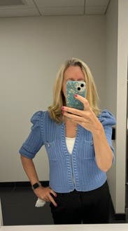 Gorgeous color and great fit! Get so many compliments every time I wear it. Love the details, even the shoulder pads. Elevates anything you wear with it! Love this sweater!! Glad I went with a large even though I’m usually a medium.