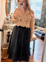 Loving this rental but take note, it's very cropped. At my age, that means wearing it with high waisted bottoms, and it looks great doing that. I've worn it with denim, sorts and a skirt. Very versatile. You can see through the open lace design, but I haven't felt rhe need for a camisole. Large fit perfectly. Great transition piece into fall.