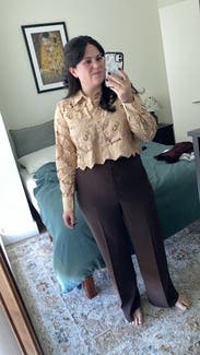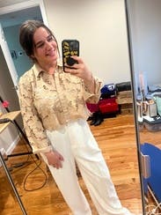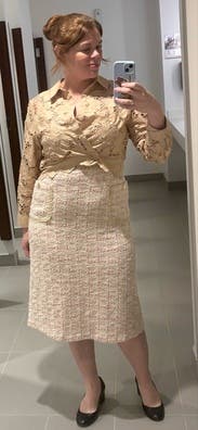 I got a ton of compliments on this shirt when I wore it on set for the TV show I work for! I did get a size larger hoping I’d have some extra space, but I am renting again in a smaller size and I might even buy this gem! I thought from the photos that it would look too stuffy on me and I was pleasantly surprised that I was able to make it look young and modern.