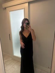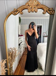 This timeless piece features a sleek silhouette that beautifully hugs your curves, creating a sophisticated and alluring look. The delicate spaghetti straps and subtle lace trim add a touch of femininity, while the luxurious satin fabric offers a smooth, silky finish that glides with every step.