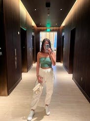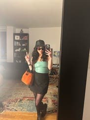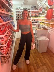 So happy I took a risk on this set! The textured satin joggers playfully offset the faux leather of the top, and the color made the look conducive to both day and night. I’m a classic XS and the top fit me perfectly.