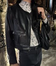 Command attention in the Laundry by Shelli Segal Vegan Leather Patch Pocket Jacket, a cropped, black staple. Wear this sharp piece with high-waisted trousers and heels for a bold, powerful look.