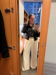 Great jacket, fully lined with gunmetal hardware. I usually rent an XL in jackets just to fit my broad shoulders and this fit great. Also has nice stretch to it not that I needed it. I wore it to work and then to dinner after with a top from Laundry and Veronica Beard bootcut jeans. Super cute, might keep it!