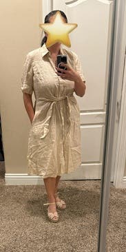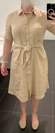 I’m a sucker for a shirtdress and summer linen so I was predisposed to fall for this beauty. I was surprised by the number of compliments I received on this dress because it’s not flashy it’s just a nicely designed summer classic. The fit is true to size. The pockets are deep and nicely placed. The skirt has buttons which can be opened for a flirty look. The color is as pictured and because it’s linen and unlined the only way to avoid wrinkling is to wear a slip. The cut will work on a variety of body types and heights. The tie at the waist allows the wearer to make it more figure flattering. This is a perfect summer dress for the office, county club or just every day wear when you want to look pulled together but not formal or flashy.
