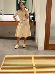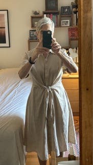 The fabric is falls beautifully and the front tie adds some shape. I wore it to an afternoon work party and will wear a few times more—very versatile! I wish the color wasn’t so bland but overall a useful dress. Fit true to size