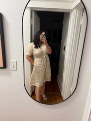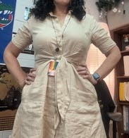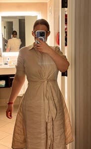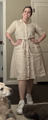 I felt confident in this one. Crushes easily after steaming, like most linen material. The material is a bit sheer in certain lighting, so be mindful of your undergarments. TTS for me but I had to tighten the knot a bit to give myself a proper waist (pear/hourglass shaped). If you have a large cup size I wouldn’t recommend sizing down because the chest will be too tight and possibly the arms too. Larger cup sizes: get your safety pins ready, like with every button up item.
