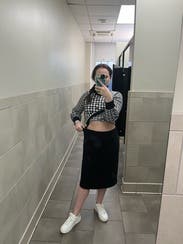 Loved this skirt... almost purchased but a bit too big. Would size down as it is a lot of material. Very warm soft material and versatile. Will definitely rent again but size down to be more fitted