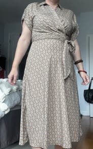 Pretty patterned dress that’s easy to put on and wear on its own. Pair w gold or silver jewelry and any beige, brown, or nude shoe. Neck line does not plunge, which is great for the office