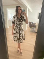 Love everything about this dress. The cut was super flattering and comfortable. The pattern stood out without being overwhelming. I wore it to work for a big client meeting and felt chic and put together paired with Rag & Bone beige booties. I almost bought the dress I loved it so much.