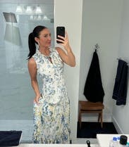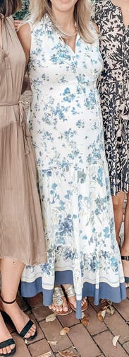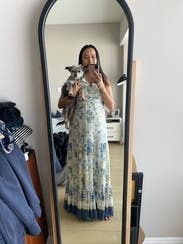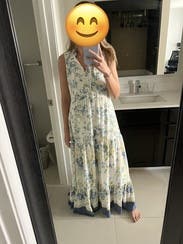Pretty maxi dress, wore to a baby shower. Fun & Flowy. Fit well over all. Maybe even a tad big, I normally wear a 6 or 8 and wore a 6 in this and it was still a bit big.