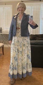 Rented for a baby shower I was hosting. It ended up being so cold so I paired it with a jean jacket, brown belt, and cowboy boots. It was about three inches too long but super comfy and I got great compliments on it.