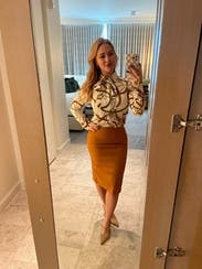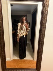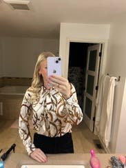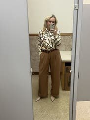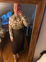 This was a beautiful blouse that definitely got me compliments. I paired it with a faux leather brown skirt and blazer, and it worked great for work.