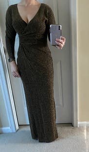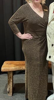 I was surprised by how much better the 8 fit than the 10. The lining allows you to go without a shawl-nice and warm for a holiday gala in the south (it was 61 degrees last night). I almost didn’t add a pin to keep the bust closed, glad I did but mostly for photo purposes to keep the black lining along the v-neck from peeking out. Loved the length for my 5’3” height. It looks more iridescent in person. A warm gold, almost bronze. Love how it was cut and shapes on the body. Also has little loops that button to anchor the dress via your bra straps on the inside. Got a lot of good compliments and shocked a few friends in a good way:-) I wish I had more places to go in it.