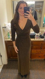 Perfect for a winter black tie wedding. Petite sizing was perfect. Fit was super comfortable & flattering. I was able to wear a regular bra & smaller heels, didn’t even need to bother with shape wear. Felt elegant & sexy yet comfortable all night long. Dress received lots of compliments!