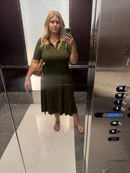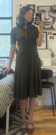 I loved the color of this dress and the fit was nice too. A great fall dress. I wore it with flats but if I rent it again, I think it would look great with boots.