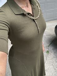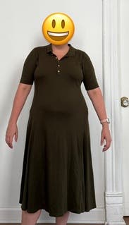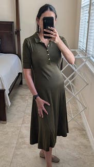 I was afraid this would emphasize my pooch, but it actually looked very flattering. The dress was longer than expected but the coverage was nice for climbing in and out of my mini van to buckle kids in car seats. Great color. Looked good with sneakers. Perfect transitional dress for a cool spring day. Functional buttons allowed me to breast feed with ease. A winner!