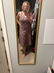cute plaid transitional dress, planned to wear it with a black leather jacket for cooler days in September. Sadly, I can not wear this, it runs small. Zips in the back and I'm broad shoulder and have some personality up front. I will try again and order a larger size. Great colors and plaid pattern.