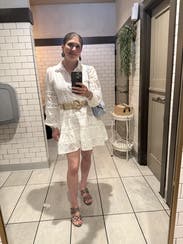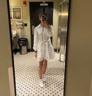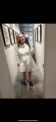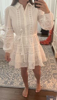 Simple white dress with delicate details. The shorter length is offset by the long sleeves. Can wear in light summer heat.