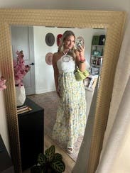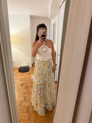 Loved this dress! So flattering and easy to wear for various summer occasions. Only small complaint is it runs a little loose in the top so the halter is really the only thing holding up the dress, the dress is unexpectedly kinda heavy, so after wearing for awhile your neck gets a little sore.