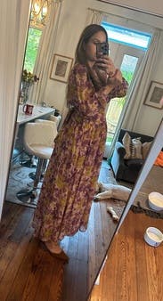 I wore this for a late September wedding in the northeast. The long sleeves were perfect for chillier weather but the sheer aspect didn’t make me uncomfortable for the sunnier times of the day. I wore the size 4 for a looser more comfortable fit. If in between I would size up because you can adjust the waist size with the tie at the low back. I wore this with 3 inch heels but if I was any shorter it may have been hitting the floor.